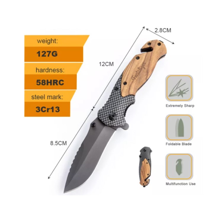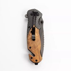 This lockback tactical knife is built to last with its durable stainless steel blade and high-quality olivewood handle. It is versatile in its use, with the ability to cut fishing rope and function as a window breaker. With heavy duty military-grade construction, this spring assisted knife also features a safe and reliable liner lock for added security. The thumb stud design allows for easy one-handed opening. Perfect for outdoor, emergency, or everyday utility. Material : Handle Material: Olive Wood and Stainless Steel; Blade Material: 3CR13 Stainless Steel. We also offer speciality knives for hunting, fishing, camping and more.