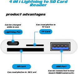 Introducing the ultimate solution for photographers, videographers, and iPhone users - the 4-in-1 lightning adapter. With this powerful tool, you can easily transfer photos and videos from your camera to your iPhone or iPad with lightning-fast speed. Say goodbye to long wait times and hello to instant access to your content. this adapter can also connect a variety of USB peripherals, such as cameras, mice, keyboards, U disks, card readers, and more. Whether you're a professional photographer or just someone who loves to capture memories, this 4-in-1 lightning adapter is a must-have accessory.