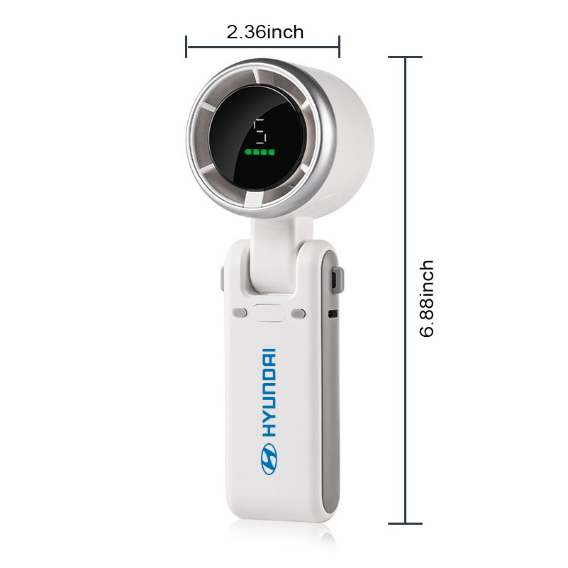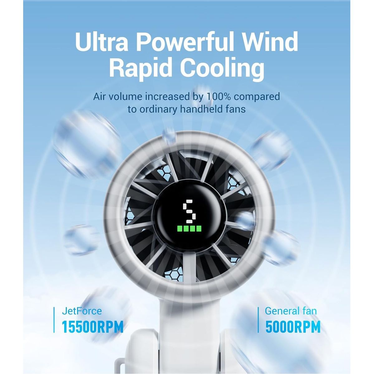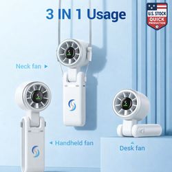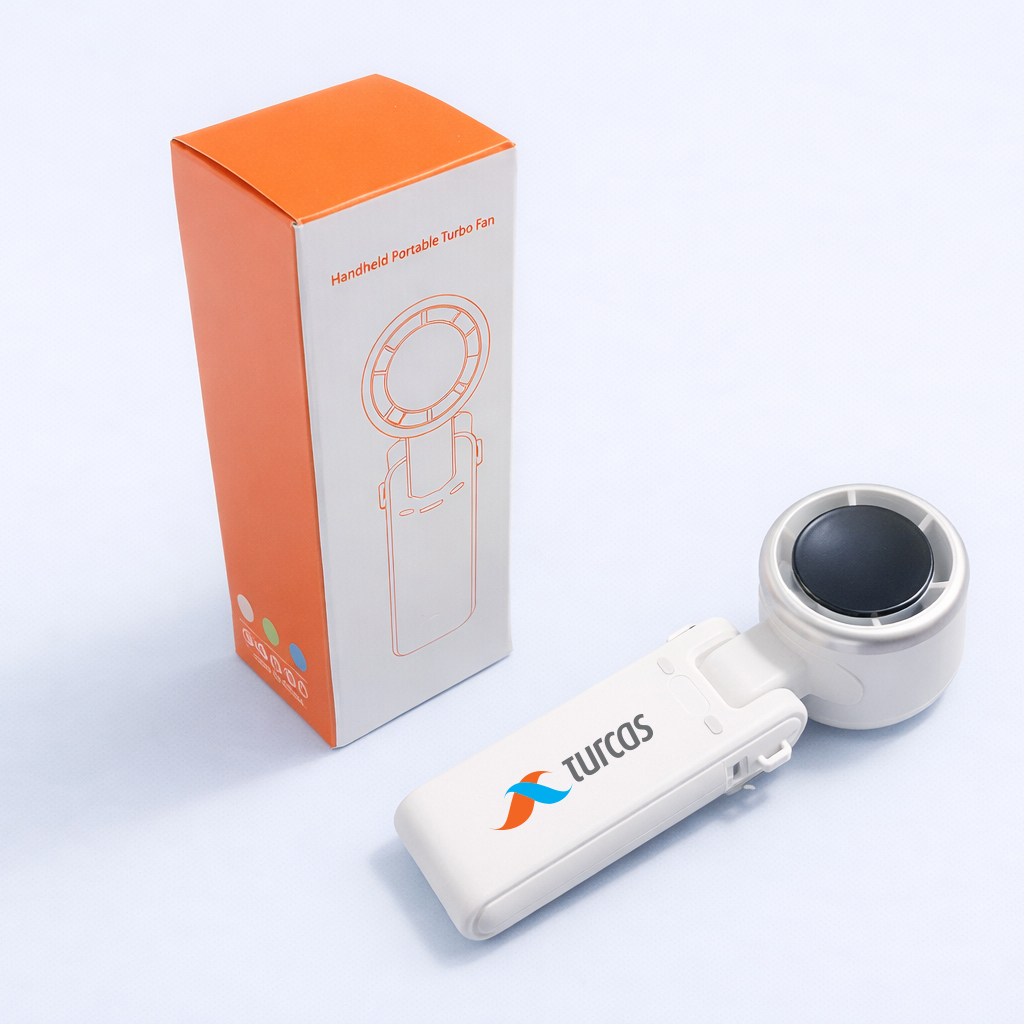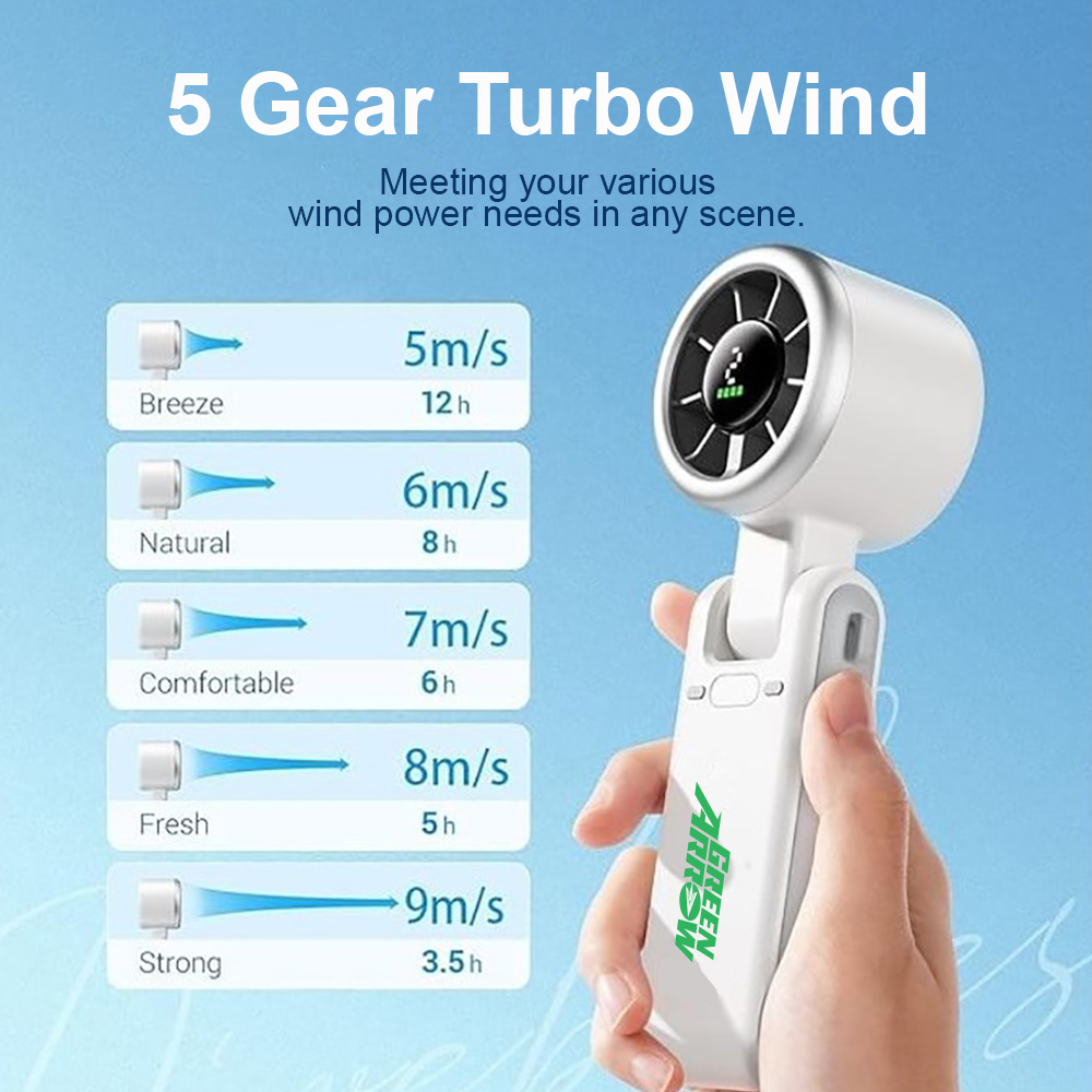 This portable turbo handheld fan features 5 adjustable speed levels and an advanced 6-blade design delivering a strong breeze for rapid heat relief. When powered on, the clear digital display shows the selected speed level as a numeric indicator, along with a green battery bar that displays the remaining power at a glance. Equipped with a built-in 1800mAh rechargeable battery, it provides long-lasting performance and can run for up to 12 hours on a single charge (depending on speed setting). The stable base allows angled desktop positioning, while the 180° foldable design and included lanyard provide versatile use as a handheld fan, desk fan, or hands-free neck fan. Accessory: Type C Charging Cable and Lanyard. Certification: CE, FCC.