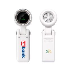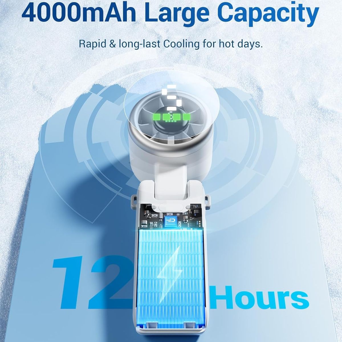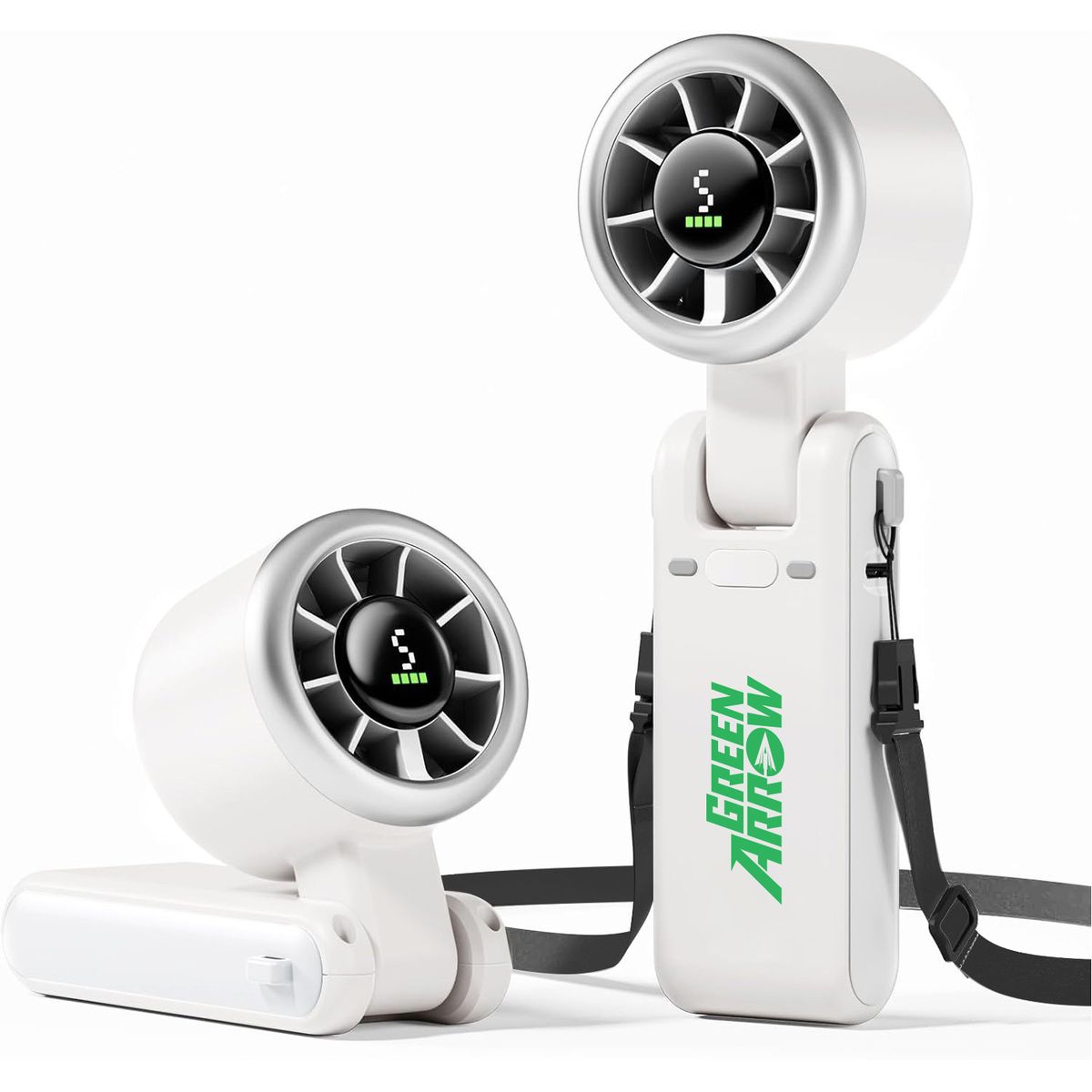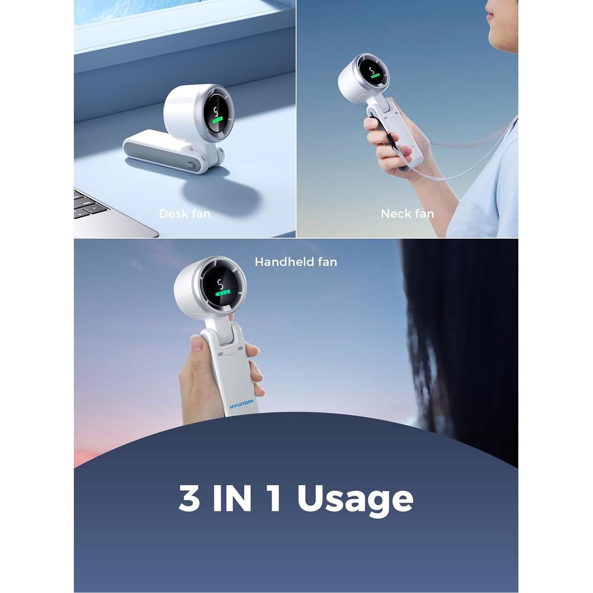 This portable turbo handheld fan features 5 adjustable speed levels and an advanced 6-blade design delivering a strong breeze for rapid heat relief. When powered on, the clear digital display shows the selected speed level as a numeric indicator, along with a green battery bar that displays the remaining power at a glance. Equipped with a built-in 1800mAh rechargeable battery, it provides long-lasting performance and can run for up to 12 hours on a single charge (depending on speed setting). The stable base allows angled desktop positioning, while the 180° foldable design and included lanyard provide versatile use as a handheld fan, desk fan, or hands-free neck fan. Accessory: Type C Charging Cable and Lanyard. Certification: CE, FCC.