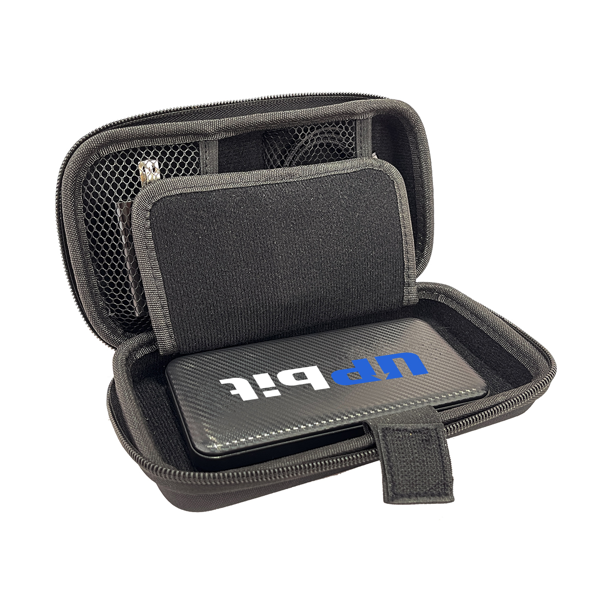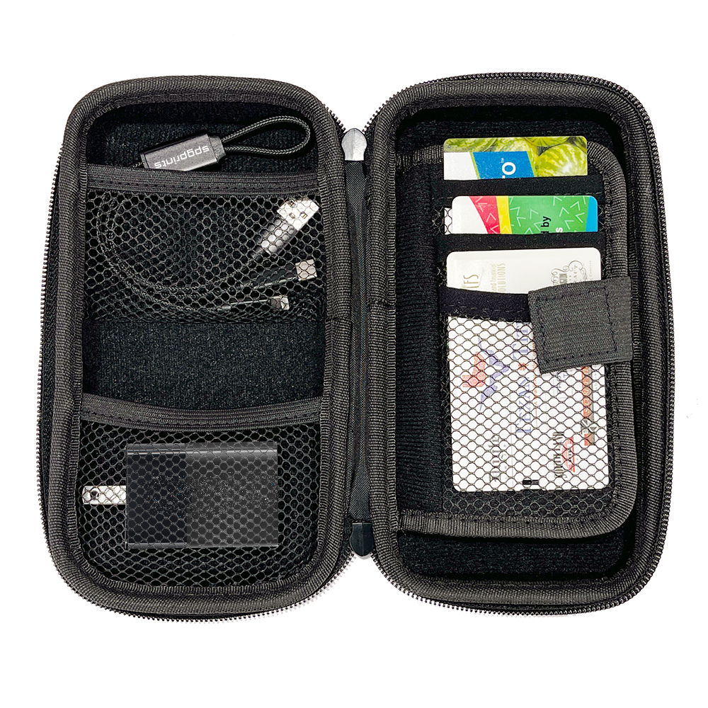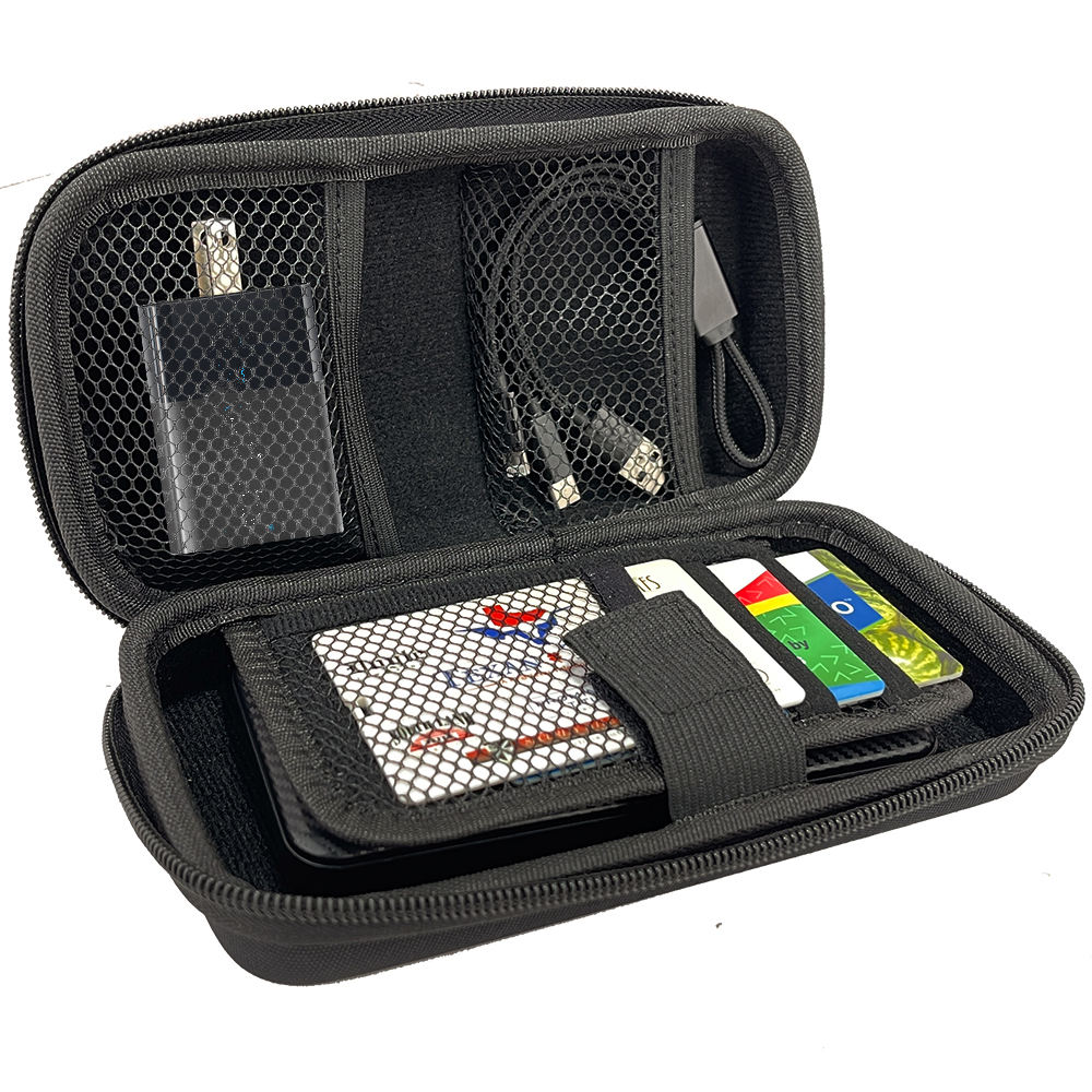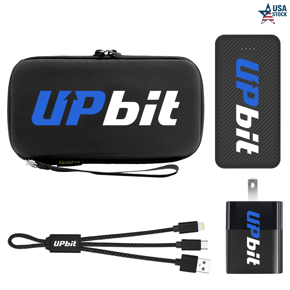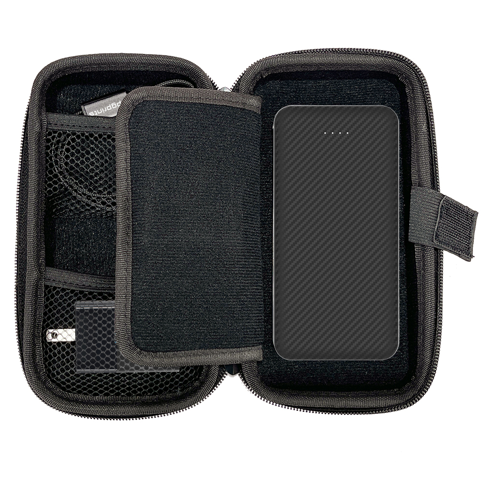 This charging set is the ultimate travel companion for all your charging needs. This set features a meticulously designed case with specialized compartments to keep your charging accessories organized and protected from scratches. It includes a 10,000mAh Carbon Fiber Powerbank, the versatile 2-in-1 USB-A & USB-C 20W Wall Charger, and a USB-C & Lightning Cable. Each component can be customized with your company's marketing graphics, logo, or other branding elements. With ample space for your essential accessories like storage cards, cables, and earbuds, this set enhances your customers' travel experiences by ensuring they stay connected effortlessly. Material: Double-Layer EVA + 420D nylon + 840D Nylon + Velvet + Neopene. Weight: 18.21 oz.