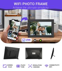 With Uhale APP and build in Wi-Fi function, you can easily send photos or short videos up to 15 seconds from anywhere in the world to multiple frames instantly through your mobile device. This makes it a great tool for businesses to continuously update their clients on products and services, as well as a thoughtful gift for sharing special moments with loved ones. Setting up the frame is quick and easy - simply plug it into a power source, download the app and connect to Wi-Fi. The device's 16GB internal memory provides ample storage for your media, you can also expand storage by using an SD Card or USB Drive. Boasting a 1280*800 resolution IPS touch screen that allow for clear visuals from any angle, it can be used in either portrait or landscape orientation with wall-mount or placed on a desk. Weight: about 600g. Accessory: Stand, AC adapter and User manual. Certification: CE, FCC, ROHS.