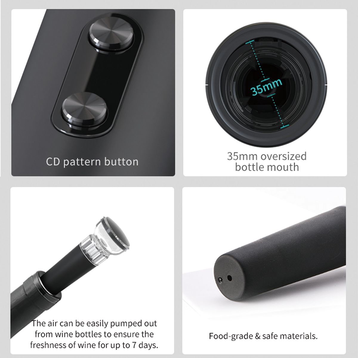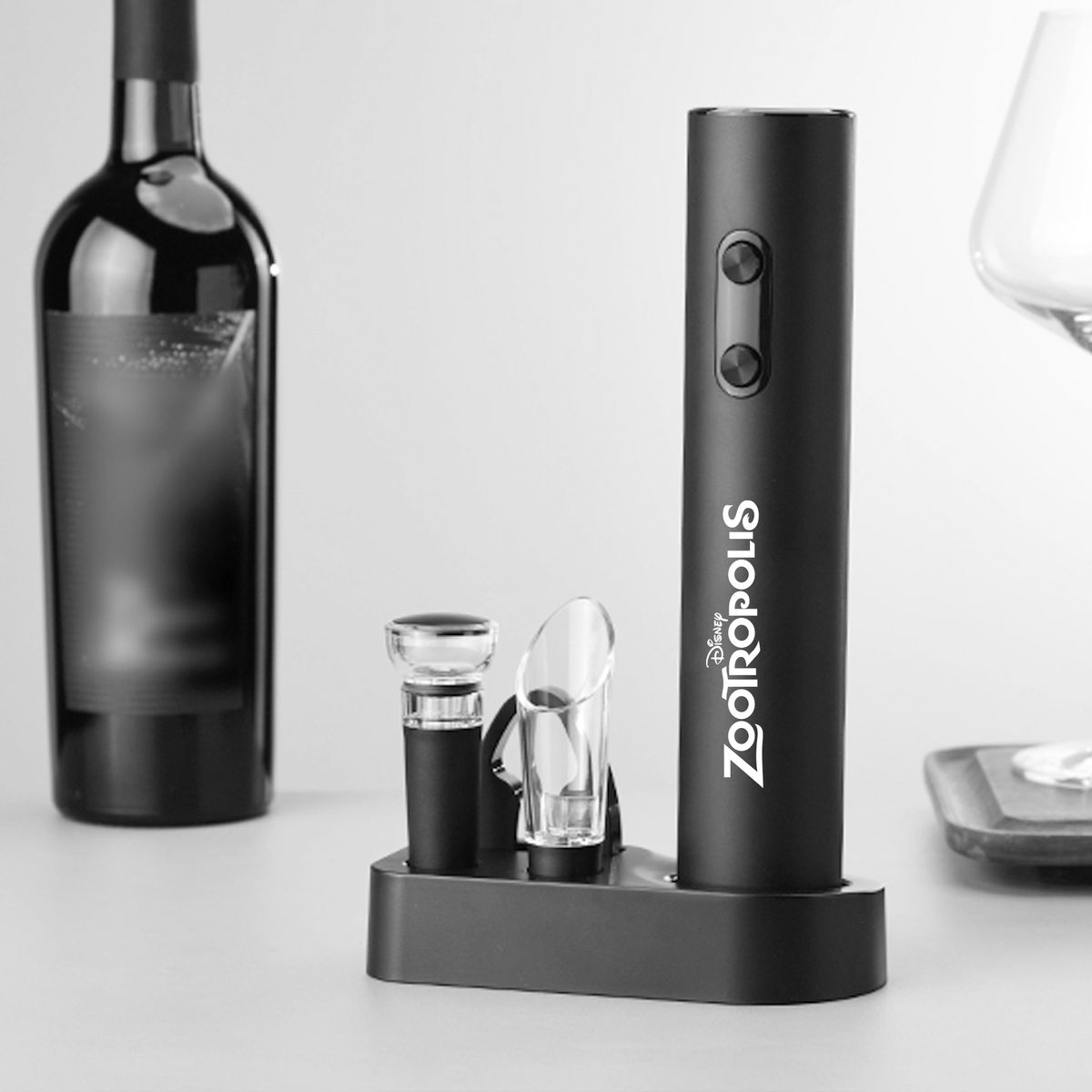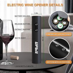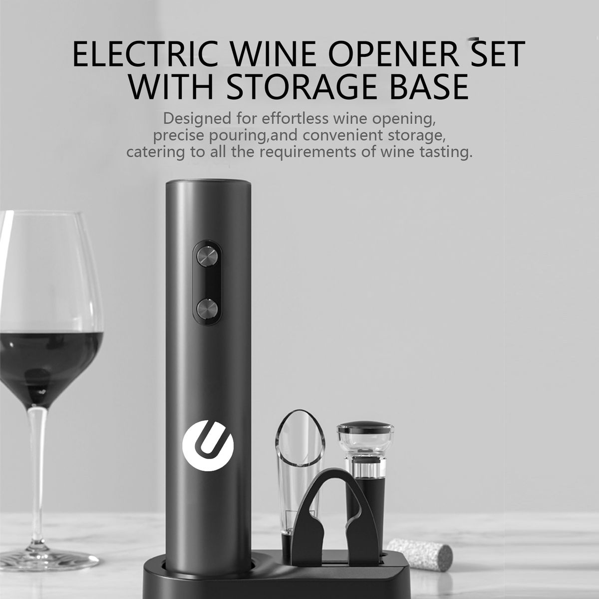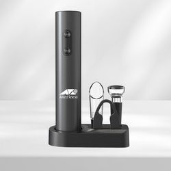 Elevate your wine experience with this sleek electric wine opener set. Includes an electric opener, wine pourer for precision pouring, a stopper to preserve freshness, and a compact storage base for organization. Customizable with your logo, making it ideal for gifting or promotions. Weight: 320g. Accessory: KB1-602301 dry battery electric bottle opener, tin foil cutter, WP-015 wine pouring device, SP-016 pull-out vacuum plug, storage base. User Manual: individual user manual. Certification: FCC, ROHS, FDA, ULUGS, LFGB, LVD, ERP, DOE.