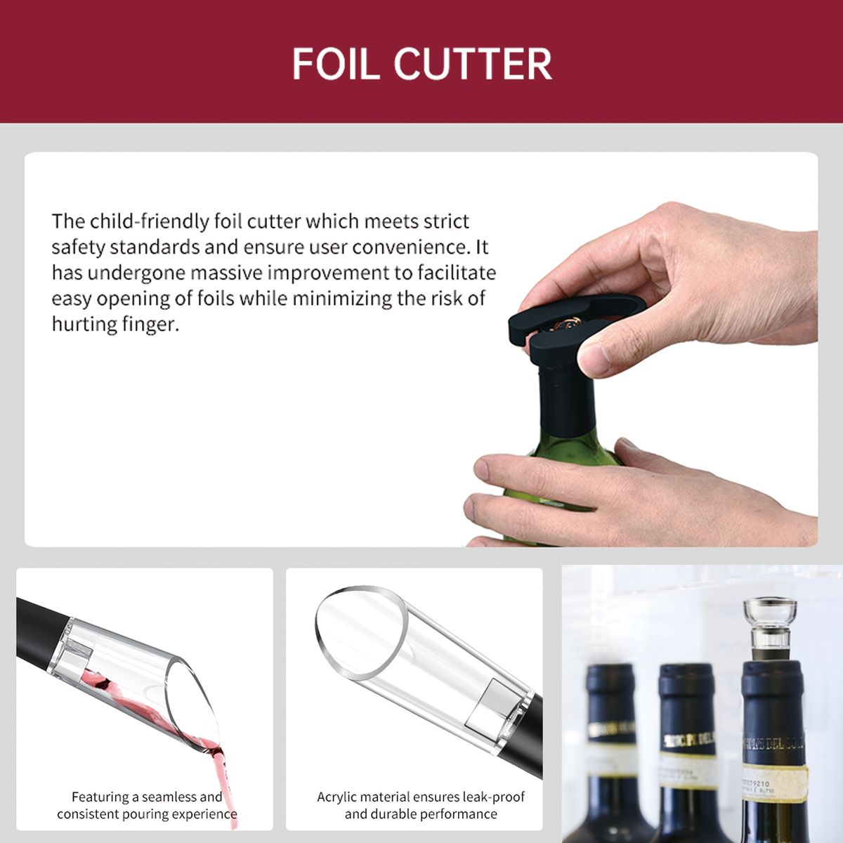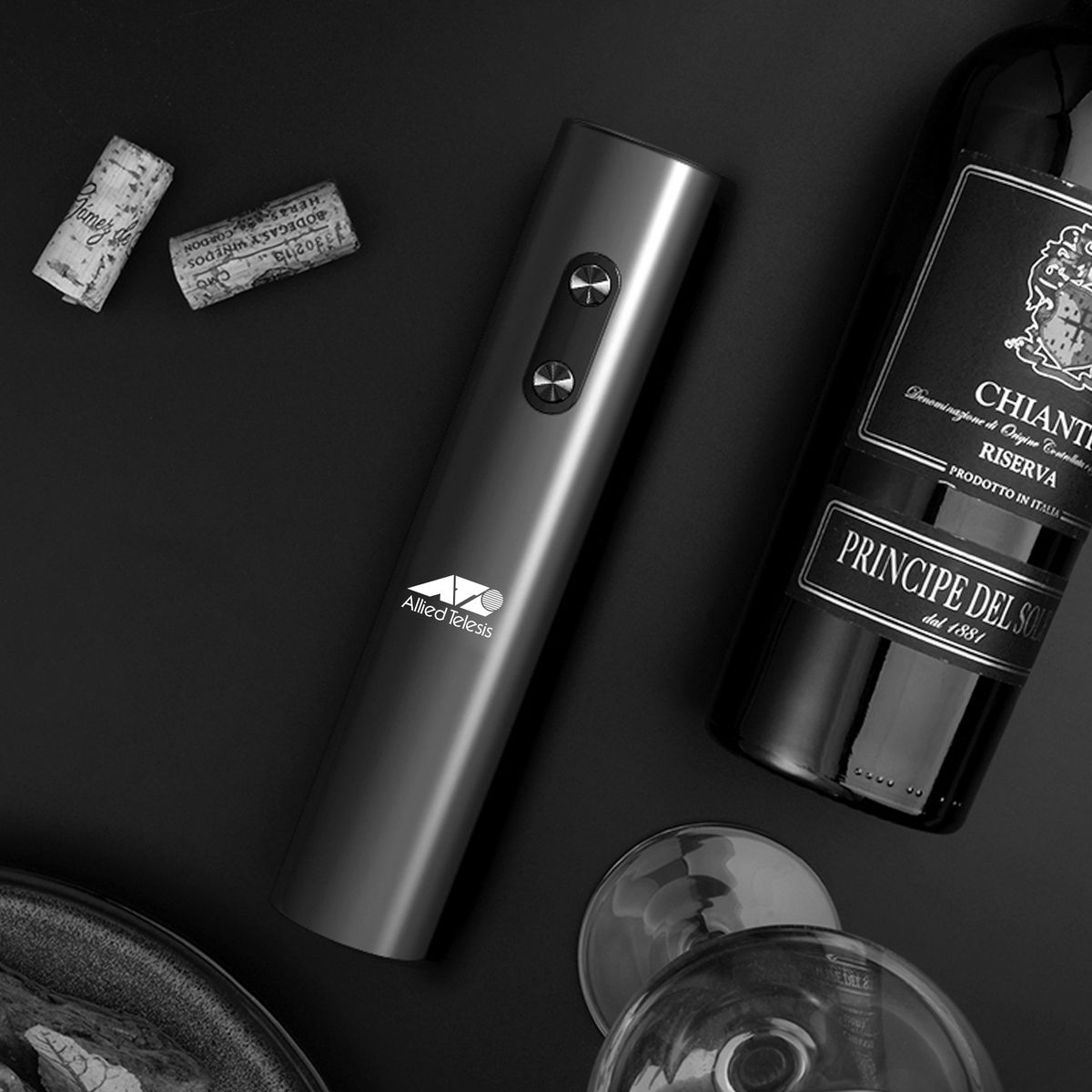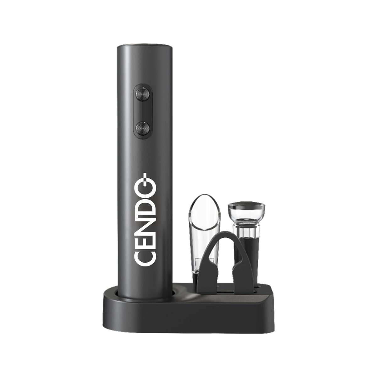 Elevate your wine experience with this sleek electric wine opener set. Includes an electric opener, wine pourer for precision pouring, a stopper to preserve freshness, and a compact storage base for organization. Customizable with your logo, making it ideal for gifting or promotions. Weight: 320g. Accessory: KB1-602301 dry battery electric bottle opener, tin foil cutter, WP-015 wine pouring device, SP-016 pull-out vacuum plug, storage base. User Manual: individual user manual. Certification: FCC, ROHS, FDA, ULUGS, LFGB, LVD, ERP, DOE.