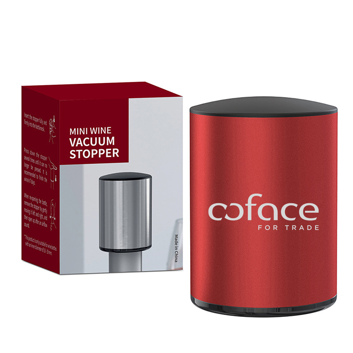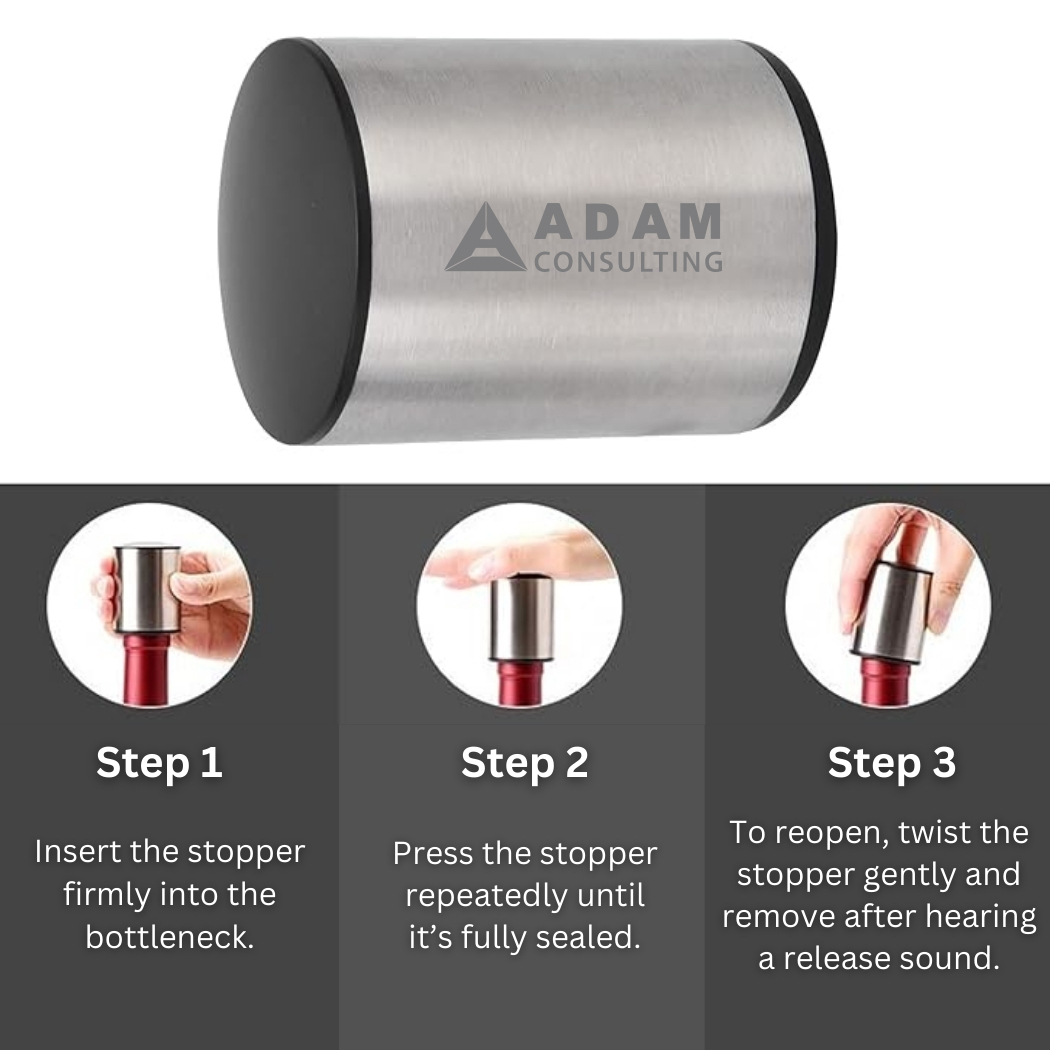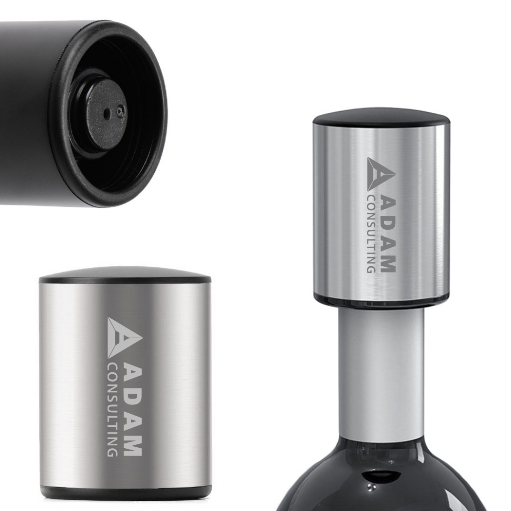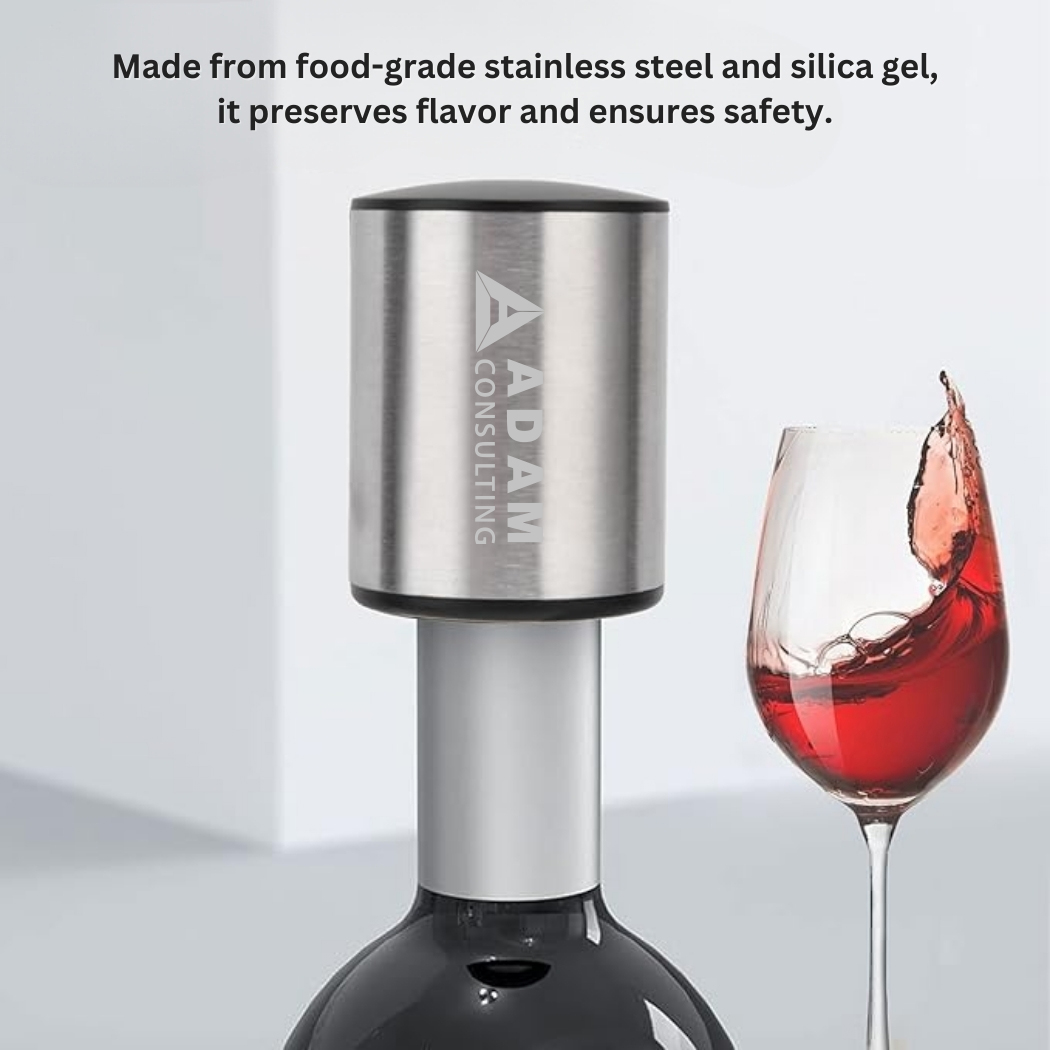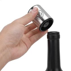 The WineVault Stainless Steel Mini Wine Stopper combines sleek design, compact functionality, and food-grade materials to keep your wine fresh for up to a week. With an air-removal system and durable metal cover, it's perfect for wine lovers, parties, or custom branding opportunities. Weight: 57.5g (±5g). Certification: FCC, ROHS, FDA, ULUGS, LFGB, LVD, ERP, DOE.