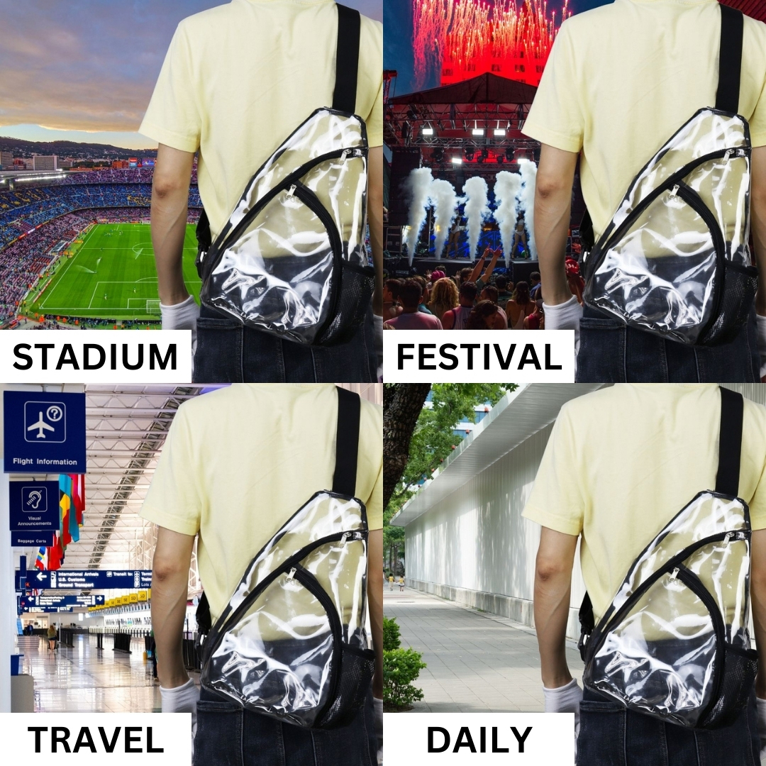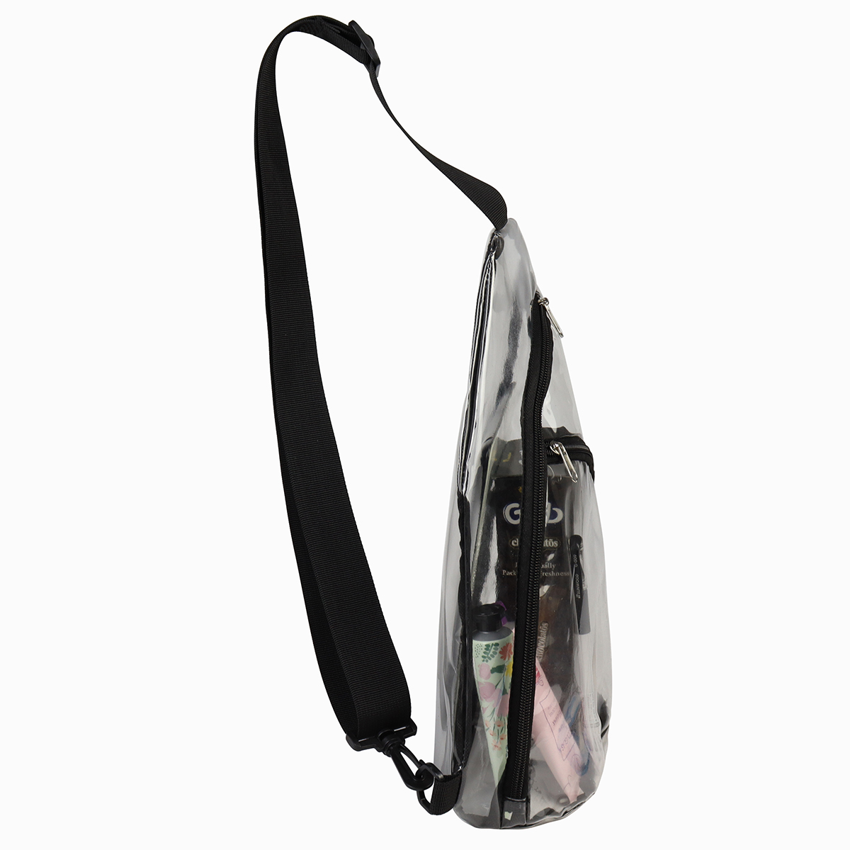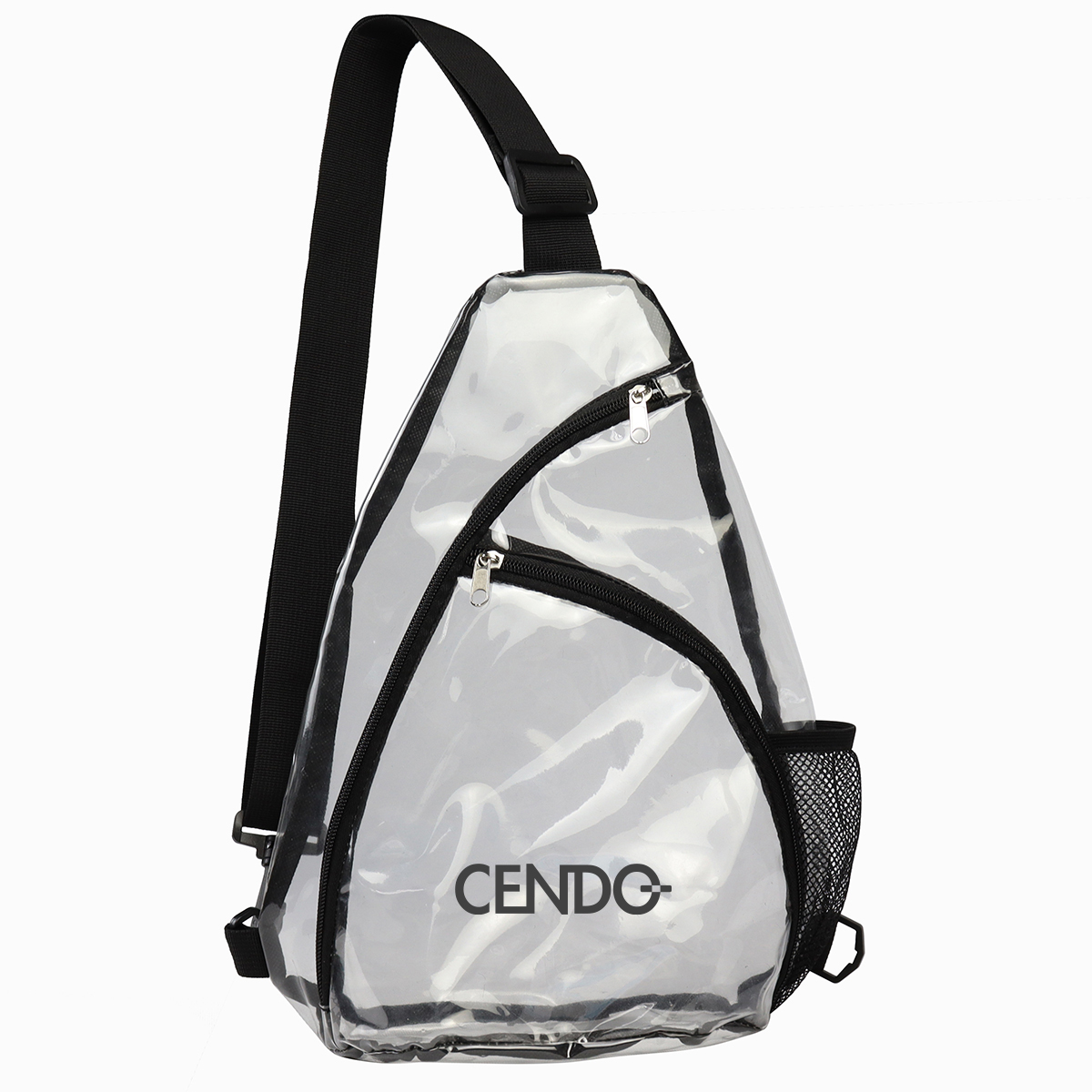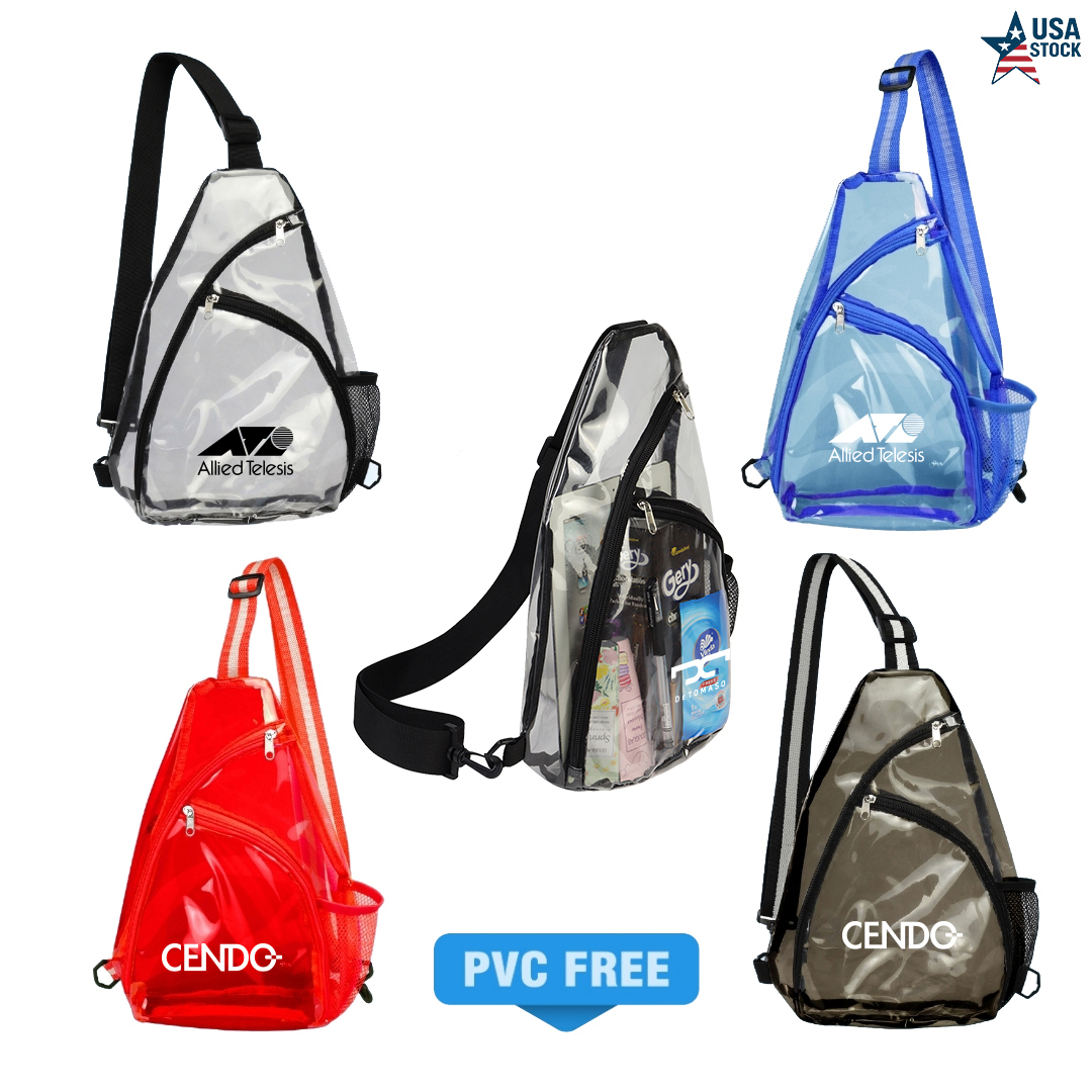 Eco-friendly clear sling bag made from 100% BPA and PVC-free materials-recyclable and biodegradable. Features a soft, odorless, and durable body with zippered main compartment and adjustable strap for crossbody wear. Ideal for concerts, sports events, and security-restricted venues. Customizable with your logo.