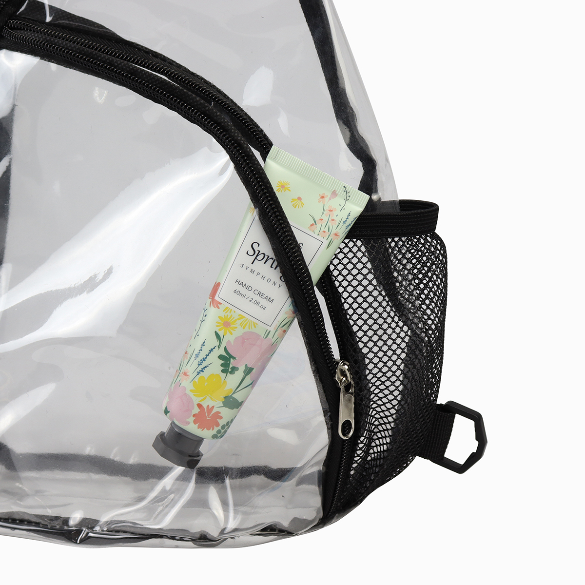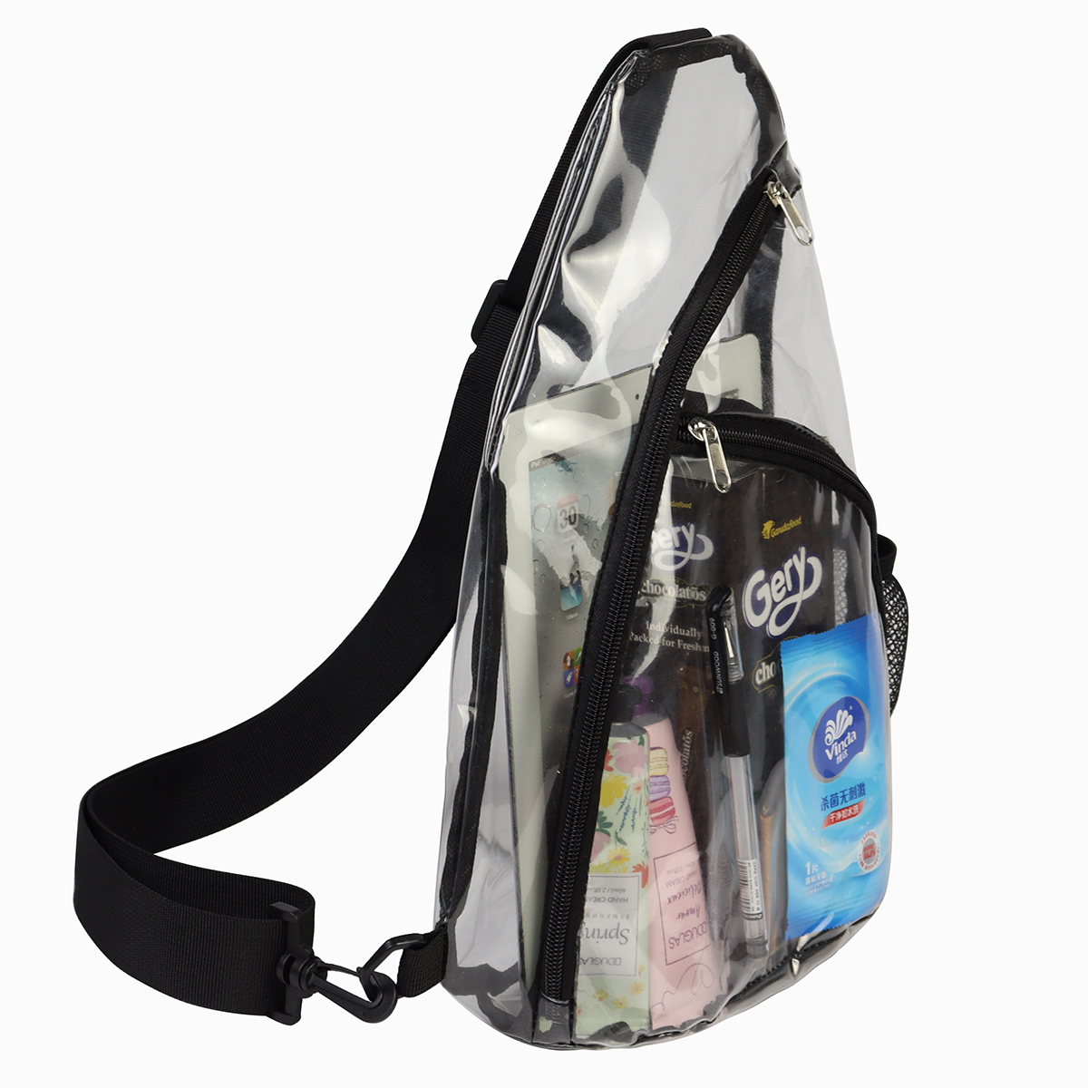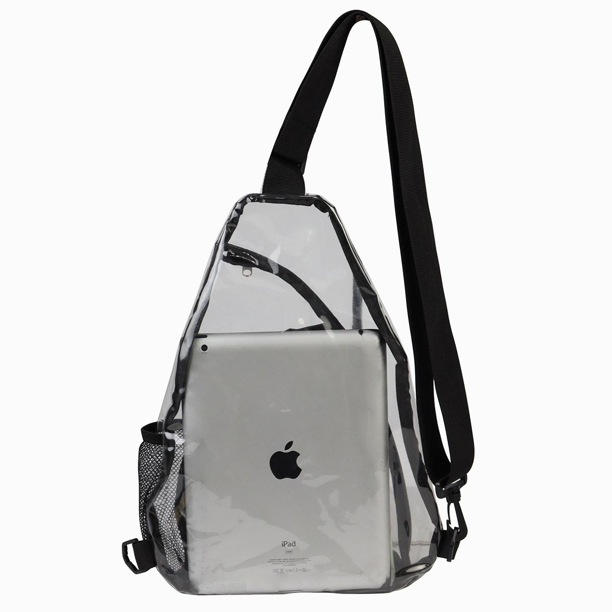 Eco-friendly clear sling bag made from 100% BPA and PVC-free materials-recyclable and biodegradable. Features a soft, odorless, and durable body with zippered main compartment and adjustable strap for crossbody wear. Ideal for concerts, sports events, and security-restricted venues. Customizable with your logo.