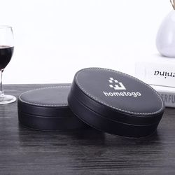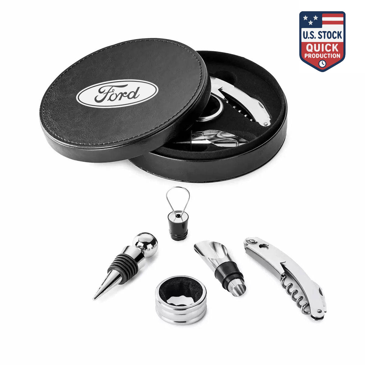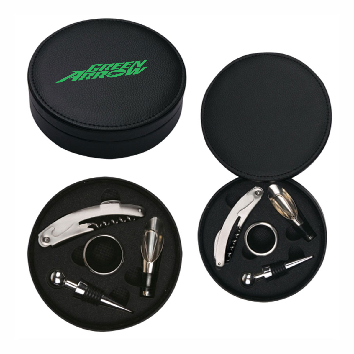 This stylish and premium leatherette case is the perfect solution for wine enthusiasts looking for a complete wine accessory set. The round black pebbled case features black stitching and a lid, providing a sleek and sophisticated look. The velvet interior and molded protective foam ensure each item is securely placed, ensuring their longevity. Inside the case, you'll find a ring, aerator, professional stainless steel bottle opener complete with a corkscrew and foil cutter, as well as a stopper with black rubber rings. This set has everything you need to enjoy a bottle of wine, and is perfect as a promotional product for events, businesses, or gifts.